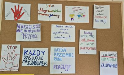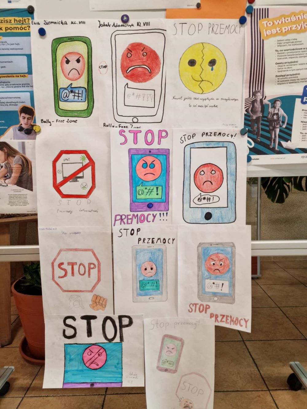 Uczniowie klas 7 i 8 wraz z wychowawcami uczestniczyli w pogadankach nawołujących do przeciwdziałania przemocy rówieśniczej i tworzyli plakaty związane z tematem. Siódmoklasiści poruszyli z wychowawcą na zajęciach temat agresji i przemocy, jej wpływu na człowieka, tworząc 10 przykazań reagowania na przemoc. Uczniowie nazwali przyczyny zachowań agresywnych.