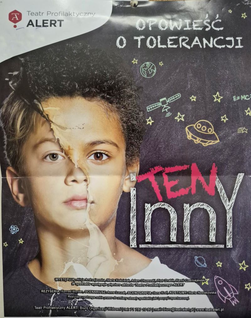 17 października uczniowie klas 4-6 wzięli udział wraz z wychowawcami w spektaklu teatralnym pt. „Ten inny. Opowieść o tolerancji”. Była to adaptacja słynnej książki pod tym samym tytułem przedstawiona przez Wrocławski Teatr Profilaktyczny „Alert”. Uczniowie poznali poruszającą historię chłopca ze zdeformowaną twarzą, doświadczonego przez życie. Opowieść ukazana na scenie skłoniła młodych widzów do refleksji nad tym, jak łatwo oceniamy drugiego człowieka po wyglądzie czy zachowaniu, zapominając o jego prawdziwych wartościach i uczuciach. Wyjazd do teatru w ramach realizowanych w szkole działań profilaktyczno-wychowawczych był okazją do zastanowienia się nad własnym zachowaniem i postawą wobec ludzi. Czy akceptujemy odmienność? Czy szanujemy i tolerujemy innych? Czy potrafimy zadbać o dobre relacje z rówieśnikami? To była bardzo pouczająca lekcja o tolerancji.